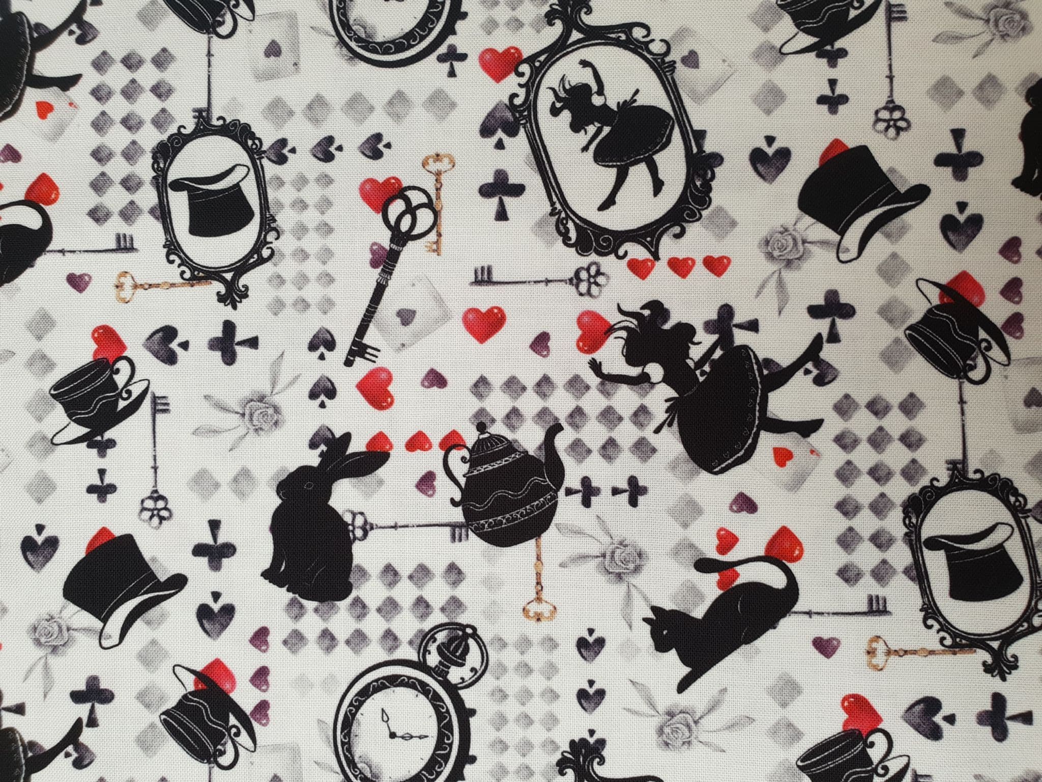 The print shows lots of Alice symbols and characters, If you are wanting to create amazing themed, this is the fabric for you.