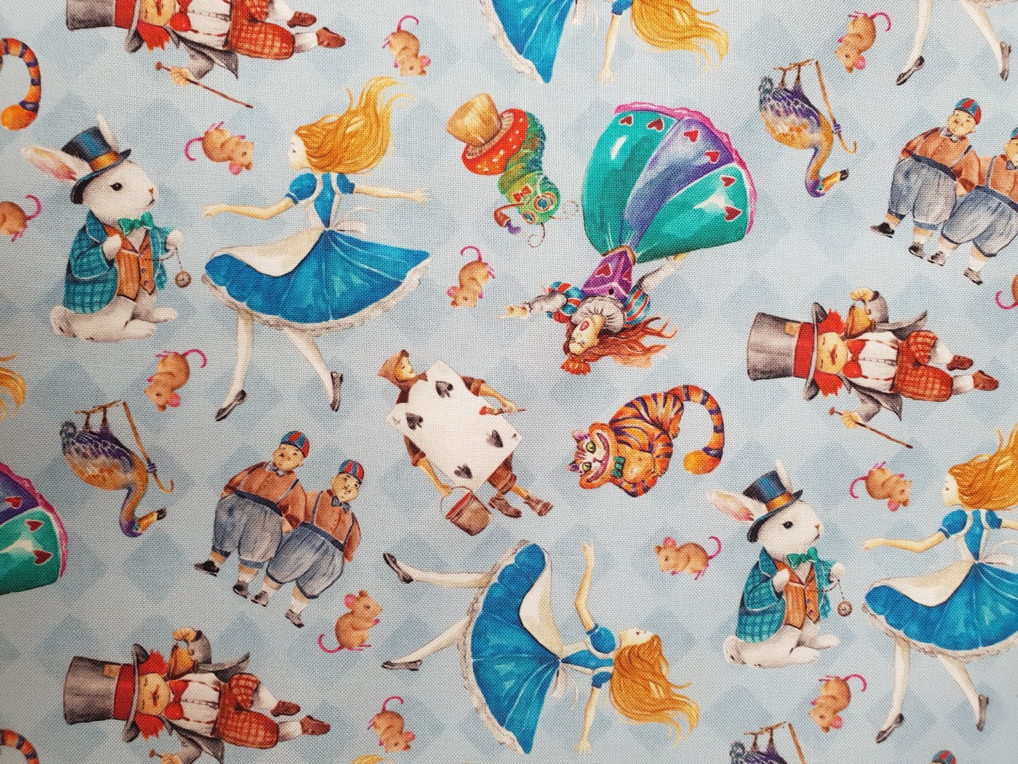 The print shows lots of Alice symbols and characters, If you are wanting to create amazing themed, this is the fabric for you.